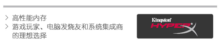 值得信赖的骇客神条(HyperX) 作为金士顿的招牌产品,每款骇客神条均精选国际知名大厂的优质颗粒,在生产过程中经过信号品质测试、软件压力测试、热测试、特殊系统和长期稳定度测试,严格的测试程序保证了其良好的兼容性和稳定性,因此骇客神条不但超频能力极为出色,而且在高温、高压、长时间连续工作等严苛环境下依然能够保持优秀的稳定性。 |