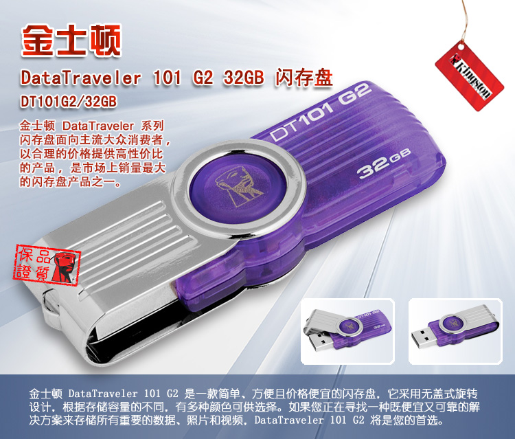 金士顿 DT101G2 32G U盘 紫色 颜色随机发货