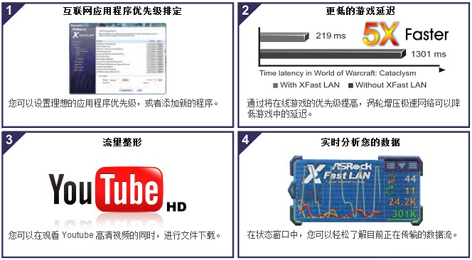 华擎涡轮增压极速网络是一个智能的管理工具,能帮助您管理互联网应用程序的优先级,简化您的数字生活,并帮您实现更多。创新功能包括:互联网应用程序优先级排定,更低的游戏延迟,流量整形,并可实时分析您的数据。它是控制您网络程序的最聪明的办法。