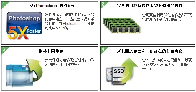 它完全利用了原来在 Windows 32 位操作系统中无法使用的那部分内存空间。华擎 XFast RAM 同时也缩短了访问过的网站的载入时间,让网上冲浪速度更快。它也同时将Adobe Photoshop的速度提高了5倍。华擎XFast RAM的另一个优点是,它降低了访问您的固态硬盘或一般硬盘的频率,从而延长了它们的使用寿命。