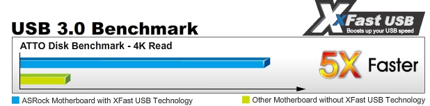 华擎 XFast USB 技术重新定义了高性能运算的新标准。华擎 XFast USB 系列主板内建了最新的 XFast USB 技术,带来世界最快的 USB 数据传输速度,再一次证明了华擎在主板业界的先锋地位。从下面的图中可以看出,华擎 XFast USB 技术可提升 USB 3.0 性能达 5 倍!