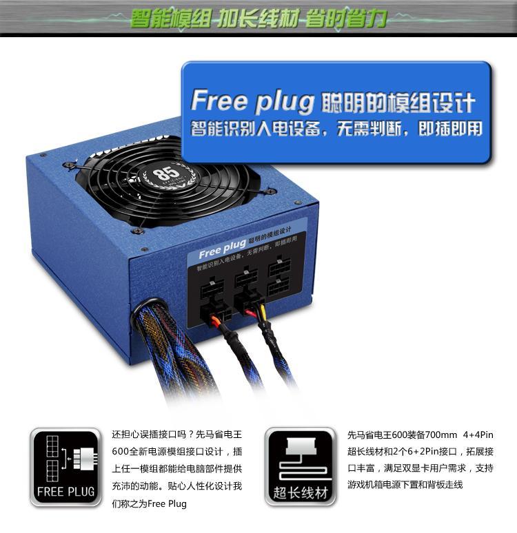 先马省电王600电源,足额大瓦额定功率600W,主动PFC+双管正激设计,转换效率高达85%;电源还采用专利智能模组化加长线材,适合时下流行的电源下置背部走线游戏机箱,是游戏玩家首选的主动式电源! |