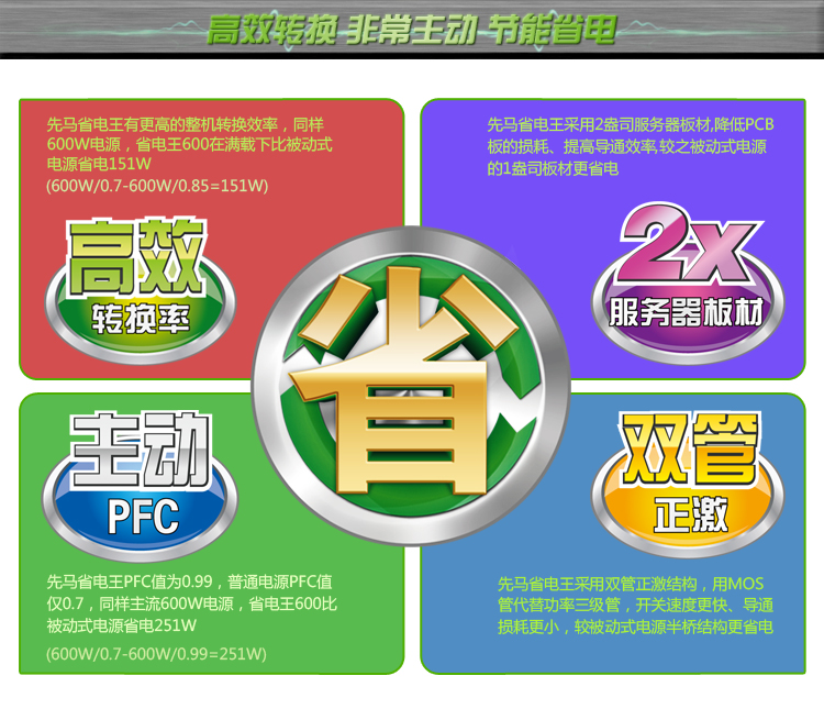 省电王600 就是省!它具有高达85%的转换效率、主动PFC、双管正激结构,还采用了服务器板材和智能模组接口,而这一切仅需299元,这就是先马省电王,买得省,用得更省!