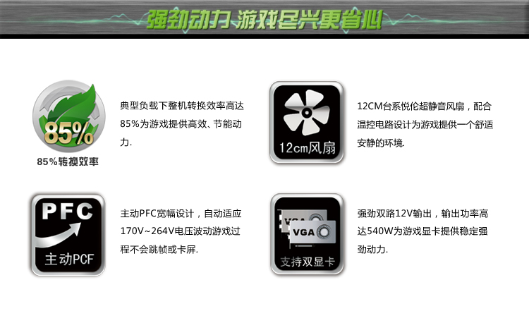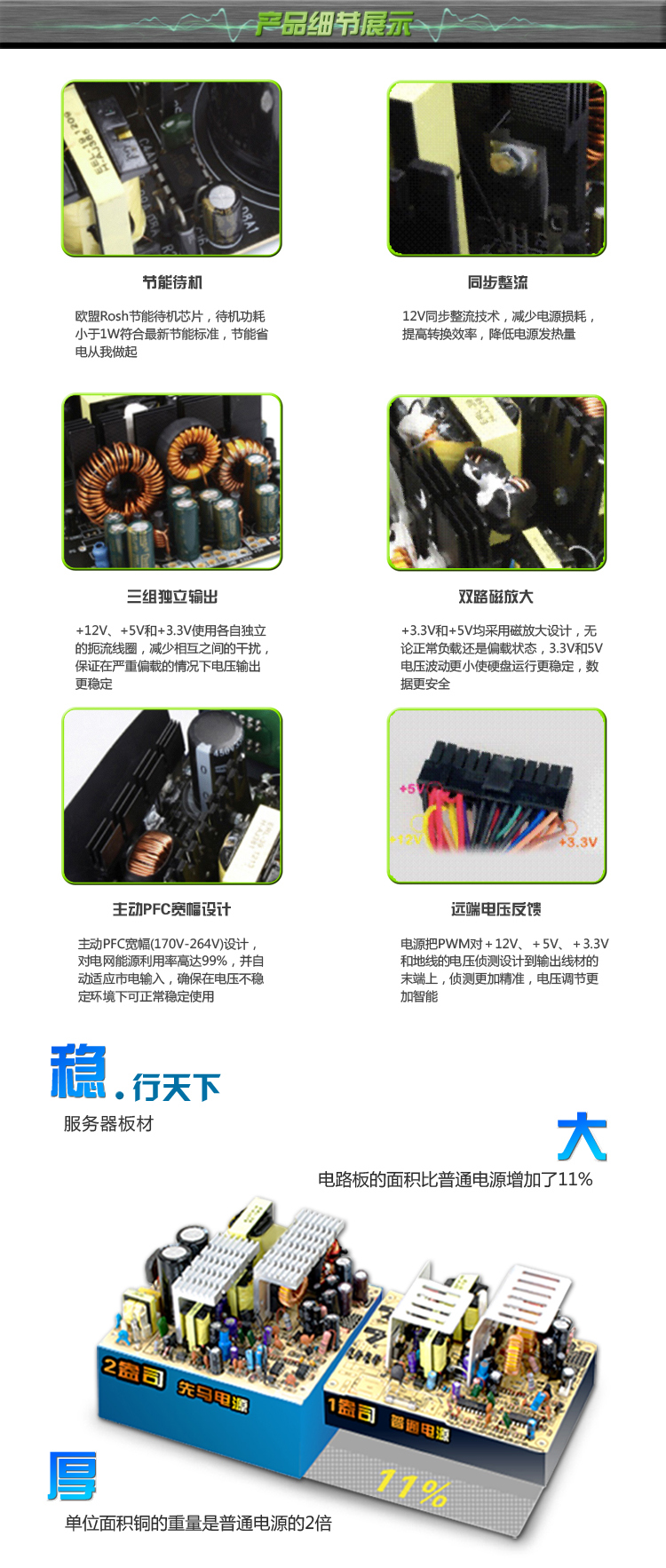 | 特性 | 采用Intel EPS 12V 2.92服务器版本规范,并向下兼容 智能模组设计,智能识别入电设备,无须判断,即插即用 额定功率600W,强大的双路+12V输出设计,输出功率高达540W 主动PFC宽幅(170V-264V)设计,对电网能源利用率高达99% 在典型负载下,转换效率高达85%以上,节能、环保、更省电 领先的双管正激,有效降低开关管损耗,提高电源整机效率 2盎司的服务器板材设计,有效降低PCB板损耗,提高效率 12CM超静音风扇,配合温控电路设计,噪音低、寿命长 装备超长线材,支持电源下置和背板走线,满足游戏玩家需 |