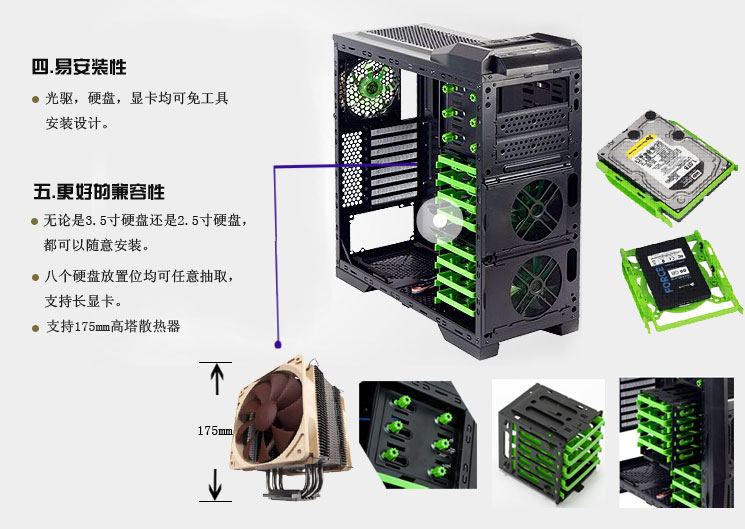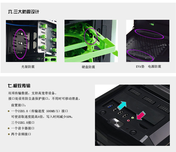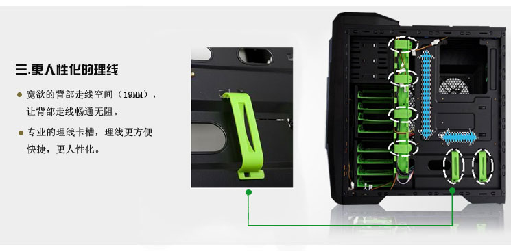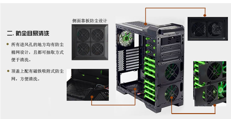 2、前板、背板、顶部多处配置12CMLED风扇,可动态调节机箱散热效能。 3、配置硬盘、显卡专用散热风扇并预留风扇安装孔,可组建独立散热风道。 4、全钢网大孔径设计,辅助散热效果更佳。 5、进风孔安装防尘棉,多处安装磁铁吸附式防尘网,不仅防尘而且方便清洗。 6、硬盘架、光驱架、前置风扇安装位、电源安装位等多处有防震设计,保护电脑配件平稳运行。 7、宽裕的背部走线空间和专业的理线卡槽设计,使背部走线更专业、方便、人性化。 8、光驱、硬盘、显卡均采用免工具设计,安装快捷、方便、人性化。 9、机箱内部空间宽裕,可兼容高端CPU、高端散热器、高端加长显卡等DIY配件,兼容性强。 |
