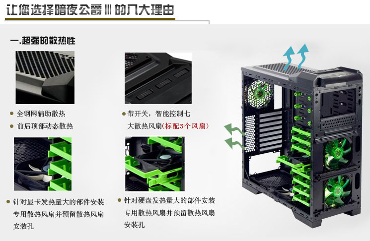 1、专为高端玩家设计,采用全钢网、电源下置、全黑化等元素,引领高端机箱潮流。