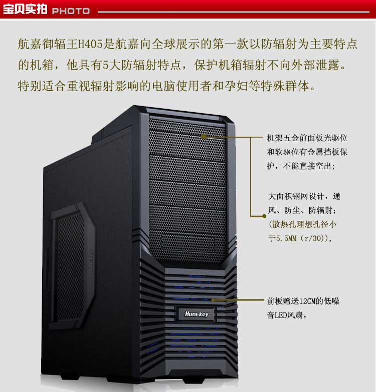 航嘉 御辐王H405 中塔式机箱(防辐射/USB3.0/免工具装置/水冷口)