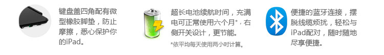 运用磁感应技术,可自动唤醒/休眠你的iPad,打开键盘盖时即可启动 iPad,关闭键盘盖时 iPad 自动进入休眠状态,无需再按开关键,不但极大方便使用,同时又减少按键损耗。