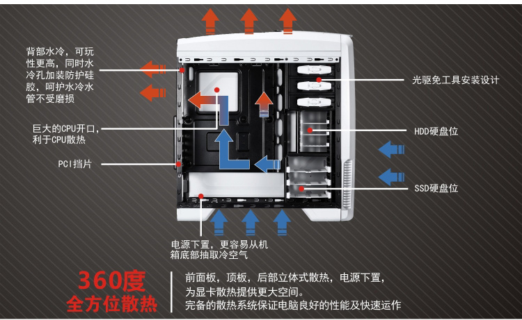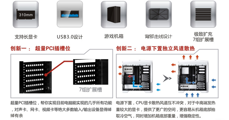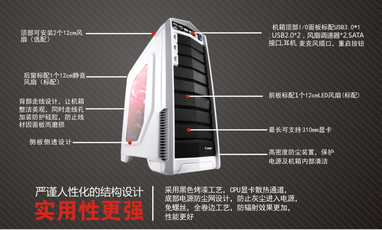 | 特性 | USB3.0,SSD,顶部易插拔,双风扇,可控开关、无极变速,侧透,完美背线 |
