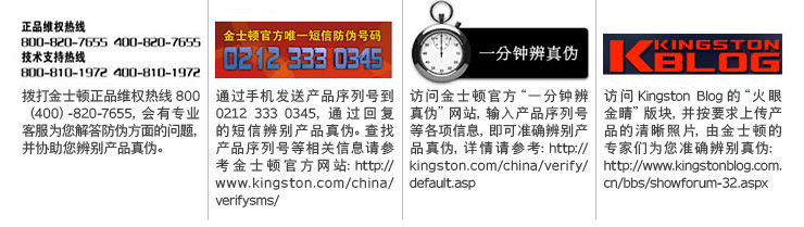 终身保固,免费技术支持,免除所有后顾之忧 金士顿为 Class 10 microSDHC 闪存卡提供终身保固和免费技术支持服务,消费者如在使用中出现任何问题,都可以直接拨打金士顿技术支持热线800-810-1972获得专家的解答。如果产品出现故障,消费者可联系当地的金士顿授权服务中心,享受保固服务。金士顿全国授权服务中心地址可到官方网站查询(http://legacy.kingston.com/china/support/center/network.htm)。 |