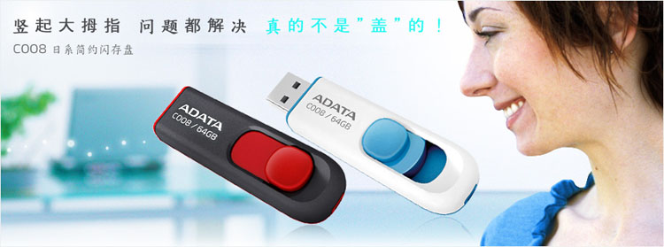 推出只需要一根大拇指轻推,不必拔盖即可顺畅开关使用的闪存盘,C008 闪存盘,解决您所有使用上的困扰。您曾经遇过情况慌乱,只能使用一只手的情况?或是闪存盘的帽盖莫明遗失的困扰吗?威刚 C008 闪存盘,外型简约圆滑,配色双色时尚,再搭配贴心的正推伸缩 USB 接头使用设计让你不需要再担心任何突发状况,随身体验处处为你的时尚科技。