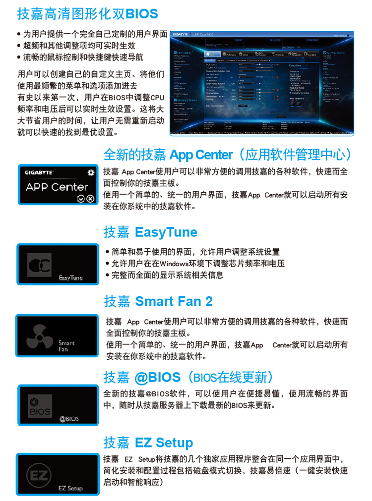 | 独家特色 | 支持 Q-Flash (BIOS 快速刷新) 支持Xpress Install (一键安装) 支持APP Center (应用中心) * APP Center ( 应用中心) 支持的程序会因不同主板而有所差异;各程序所支持的功能也会依主板的规格而不同。 - @BIOS - EasyTune - EZ Setup - USB Blocker 支持 ON/OFF Charge |