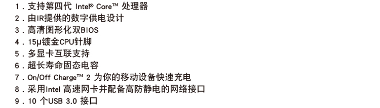 | 特性 | 4相混合数字供电 2个64 Mbit flash 使用经授权AMI EFI BIOS 中文高清图形化双BIOS PnP 1.0a、DMI 2.0、SM BIOS 2.6、ACPI 2.0a |