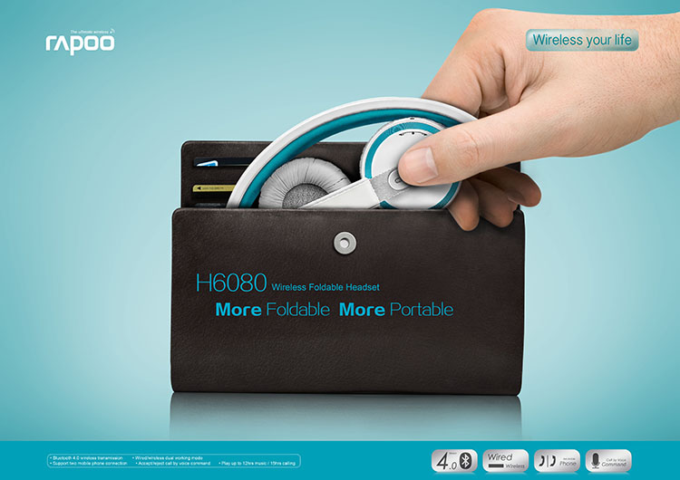 折叠式便携设计 H6080可像眼镜一样进行折叠,根据耳机的构造进行折叠后拿在手里非常方便,还可放在配备的收纳包里随带随走 |