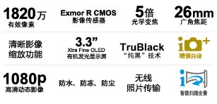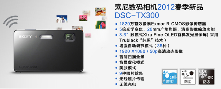 | 特性 | DSC-TX300支持无线照片传输。 DSC-TX300配备5米防水,防尘和防冻三防功能 |