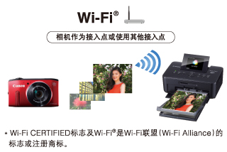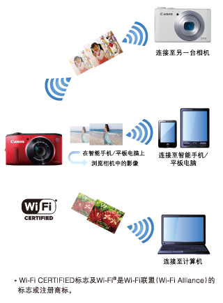 无线网络应用,更多分享方式 无线功能是一种简单快捷,通过无线进行通信的功能(Wi-Fi功能)。PowerShot SX275 HS通过该功能可将精彩的照片或短片传输至支持Wi-Fi的相机、智能手机/平板电脑、计算机以及打印机上。通过无线网络应用,可以大大丰富分享影像乐趣的方式。 |
