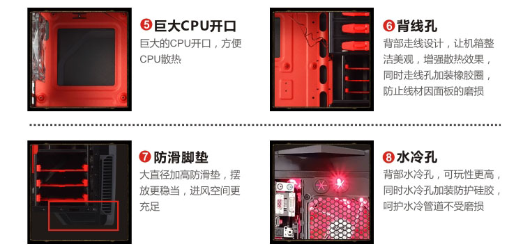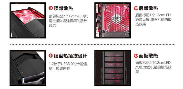 | 特性 | USB3.0,SSD,顶部易插拔,标配6个扇,可控开关、无极变速,侧透,完美背线 |
