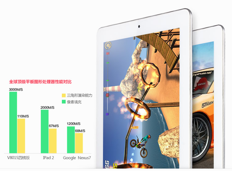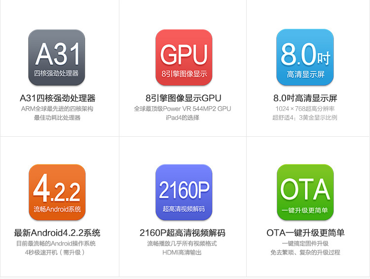 | 特性 | 强劲全志四核处理器;8引擎PowerVR SGX544 MP2显示芯片;高速DDR3内存;30万像素前置摄像头;4K超高清视频播放,蓝光3D播放,HDMI视频输出;Android 4.1智能操作系统,兼容数十万Android游戏/程序应用;完善支持flash与HTML5;内置WiFi;支持重力感应;支持在线视频;内置扬声器。 |