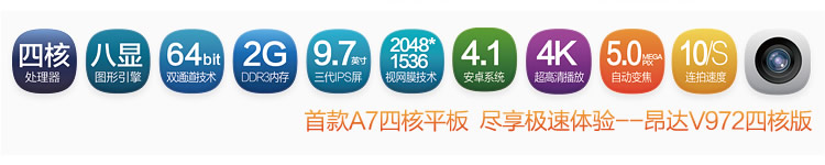 | 特性 | Retina视网膜技术(2048×1536),第三代IPS超广角屏;强劲全志A31四核处理器;8引擎PowerVR SGX544 MP2显示芯片;2GB DDR3双通道64bit位宽超大内存;500万像素自动对焦摄像头+200万像素前置摄像头,0延时,每秒10连拍,1080P录像;4K超高清视频播放,蓝光3D播放,1080P HDMI视频输出;Android 4.1智能操作系统,兼容数十万Android游戏/程序应用;完善支持flash与HTML5;内置WiFi;支持重力感应;支持在线视频;内置扬声器。 |
