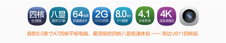 | 特性 | 第三代IPS超广角屏;强劲全志A31四核处理器;8引擎PowerVR SGX544 MP2显示芯片;2GB DDR3双通道64bit位宽超大内存;30万像素前置摄像头;4K超高清视频播放,蓝光3D播放,1080P HDMI视频输出;Android 4.1智能操作系统,兼容数十万Android游戏/程序应用;完善支持flash与HTML5;内置WiFi;支持重力感应;支持在线视频;内置扬声器。 |