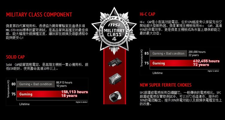 军规 4 组件 ? 符合MIL-STD-810G军规标准,带来最佳的稳定度。 ? 采用 CopperMOS, Hi-c CAP, 黄金 SSC, 银色固态电容 |