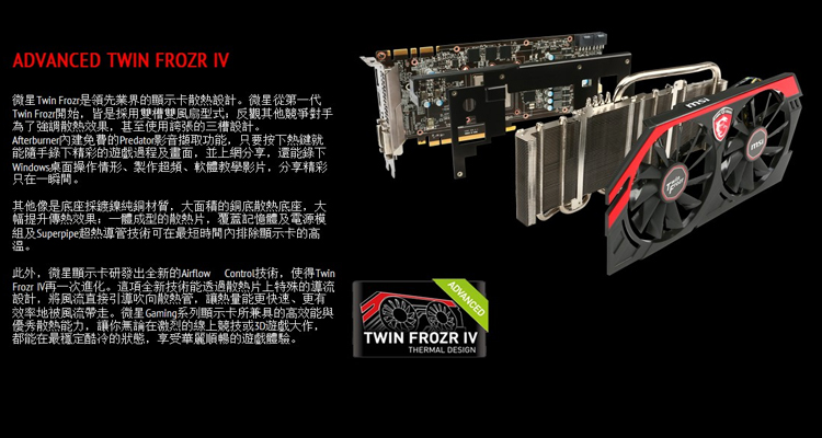先进的散热设计 ? 双10公分PWM风扇与刀锋叶片技术产生比传统风扇更多的气流。 ? 气流控制技术,透過散熱片上特殊的導流設計,將风流直接引導吹向散熱管. |