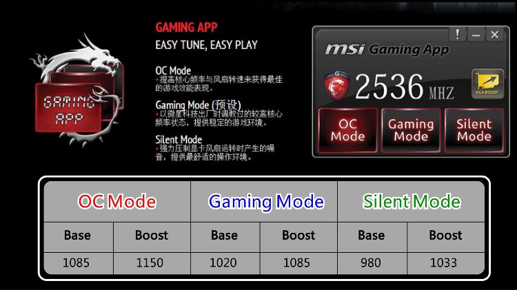 Gaming App ? OC Mode -提升核心频率与风扇速度来获得绝佳的游戏体验 ? Gaming Mode –降低核心频率与风扇速度来达到更安静的游戏环境并节省电力 ? Silent Mode –恢复原厂预设的设定 |