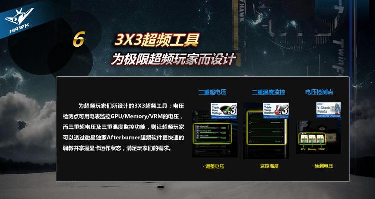微星全固态电容 微星全固态电容使用高质量的固态电容(固态铝质电解电容)。对于游戏玩家与高阶使用者而言,这项特色不只代表微星绘图卡保持业界最高质量用料,并提供重度玩家在超频/显示适配器极限调校时,一个强而有力且安全可靠的平台支持。 |