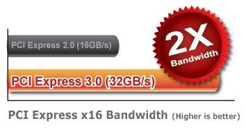 PCI Express Gen 3 拥有最高 32GB/s 传输带宽,PCI Express Gen 3 提供了比前一代快两倍的传输,为新一代游戏提供了惊人的效能。优点:- 两倍带宽- 提升效率与兼容性- 针对现有与下一代 PCI Express 卡提供极限效能 |