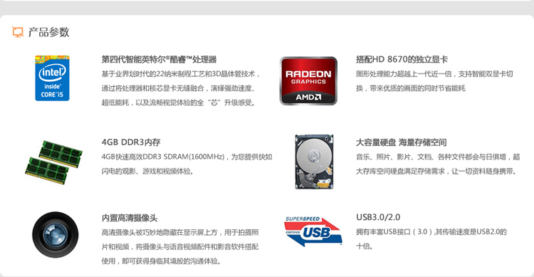 | 特性描述 | 功能超群、价格实惠。第四代酷睿处理器,独立显卡,大容量硬盘.超薄设计,10键数字小键盘 |