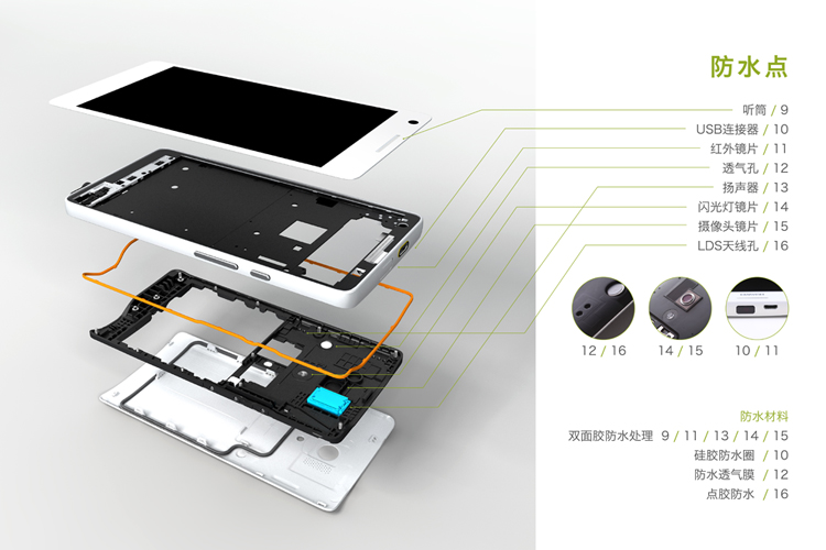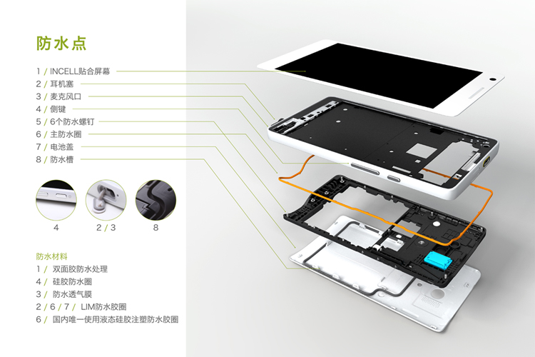 多达16处防水点,使用昂贵的液态低温硅胶注塑技术与防水器件,手机长期使用依然防水;手机防水工序在极为干净的欧洲食品级加工环境中完成,使用专业昂贵的防水测试设备测试。这些措施让手机达到了专业的IP57级防水级别,不仅可以用清水直接清洁手机,还可以在1米深净水中浸泡30分钟。