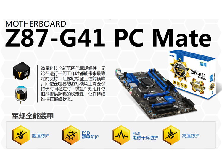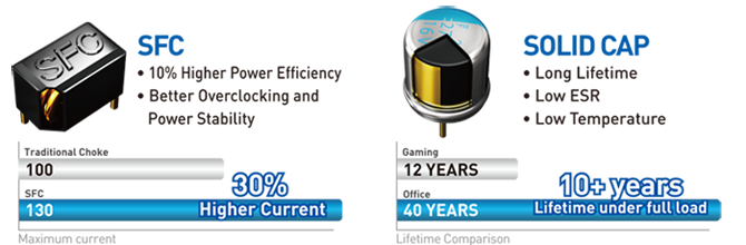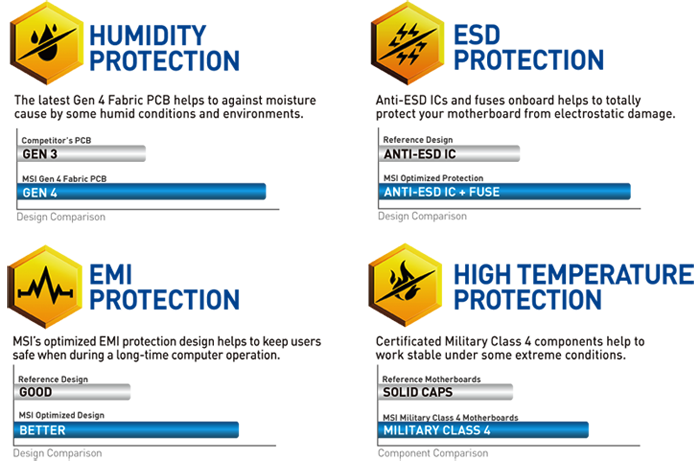 Military Class 4 微星全新的 Military Class 4 料件完全满足你的高质量游戏需求。微星的 Military Class 4 料件提供最安定的稳定性,玩游戏绝不当机。 |