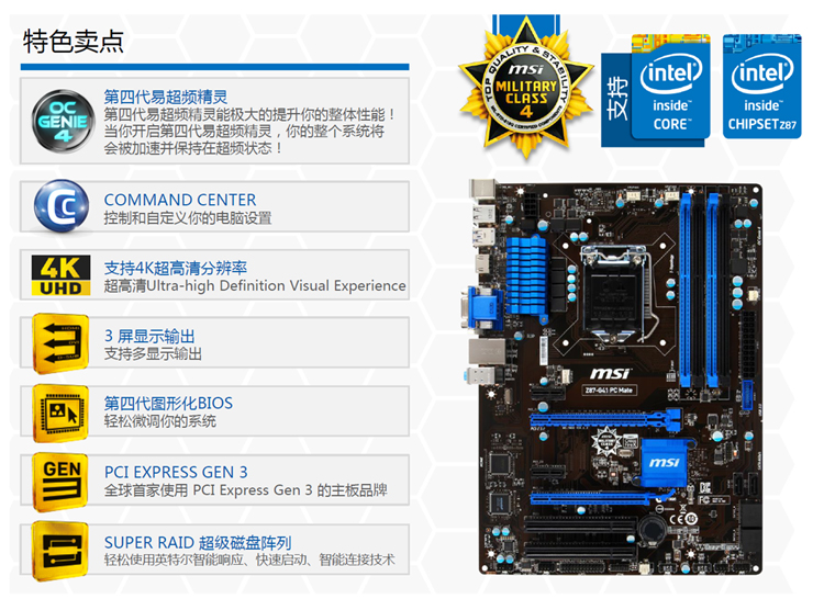 | 独家特色 | Military Class 4,Fast Boot,Military Class Essentials,第四代易超频精灵,支持4K超高清分辨率,3显示屏输出,超级磁盘阵列,Sound Blaster Cinema,全球第一 PCI Express Gen 3 主板,M-Flash,Live Update 5 |