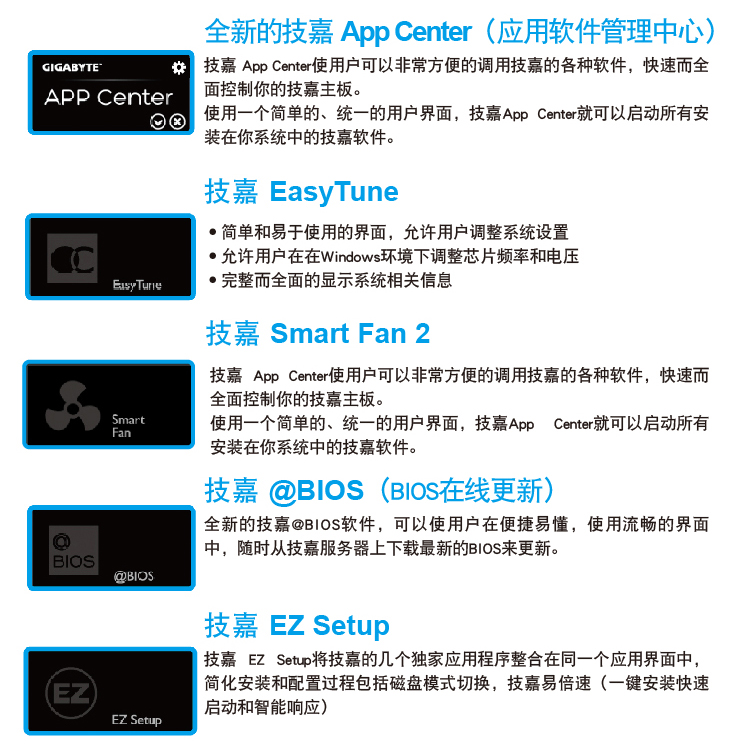 | 独家特色 | 支持 Q-Flash (BIOS 快速刷新) 支持Xpress Install (一键安装) 支持APP Center (应用中心) * APP Center ( 应用中心) 支持的程序会因不同主板而有所差异;各程序所支持的功能也会依主板的规格而不同。 - @BIOS - EasyTune - EZ Setup - USB Blocker 支持 ON/OFF Charge |