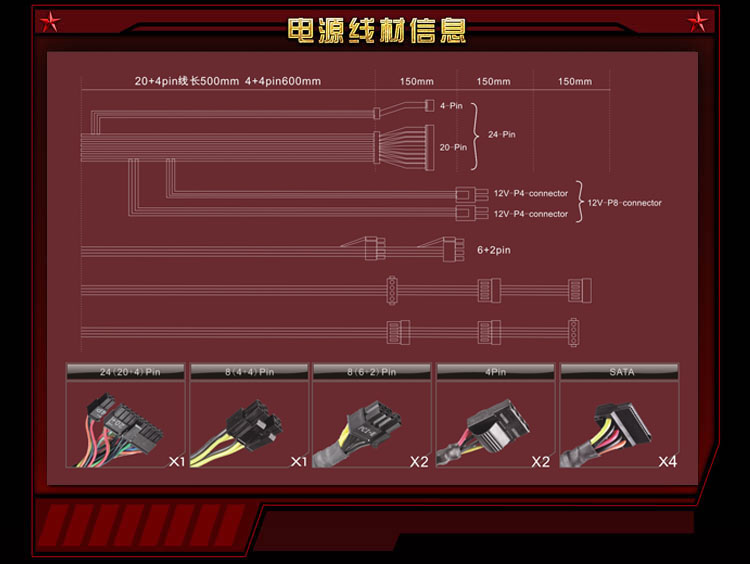 | 电源线长 | 20+4pin线长50mm;4+4pin线长600mm |