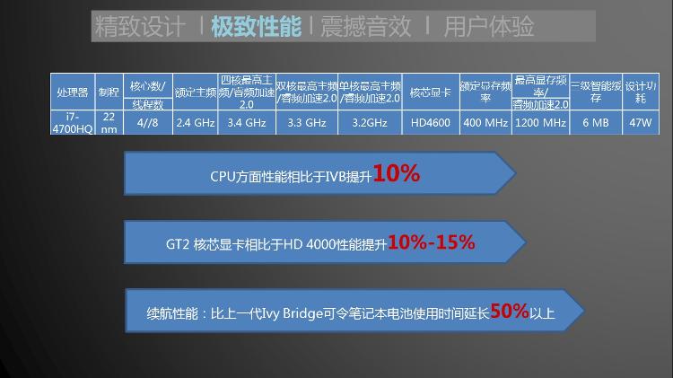 CPU类型 第四代智能英特尔酷睿i7处理器CPU型号 i7-4700HQCPU核心数 四核CPU速度 2.40 GHz三级缓存 6MB