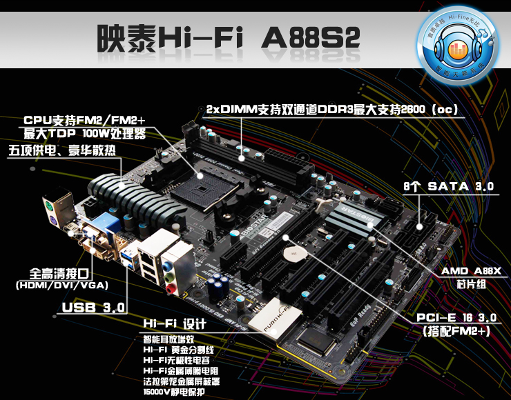 映泰 Hi-Fi A88S2 主板(AMD A88X/ Scoket FM2+)