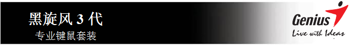 Genius 最新推出了一款专业键鼠套装:黑旋风3代!赶紧来体验一下吧!此款套装专为网吧游戏而设计,键盘上下盖和键帽均采用了高强度的ABS工程塑料,可以有效地 抗暴力和抗摔打,键盘的薄膜电路采用了防水封胶设计,可以达到四星级的防水标准!针对网吧高强度的使用环境,键帽采用了镭雕技术,可持久耐磨不褪色!该套 装的鼠标采用了高精度的光学引擎,移动和定位更精准,它还内置了配重块,手感更为舒适自然!