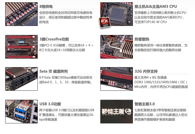 | 芯片组描述 | AMD 990FX北桥+SB950南桥芯片组 | ||