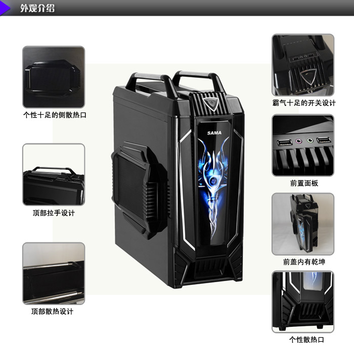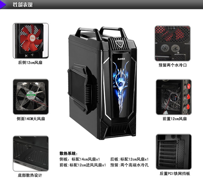 | 特性 | 顶盖提手设计、全尺寸主板托盘设计、霸气开关设计;防尘铁网+防尘棉;侧板标配14cm风扇;后板标配12cm风扇 |