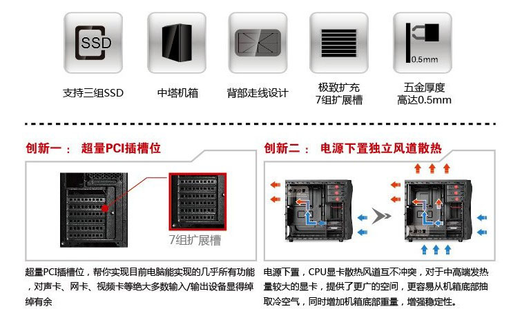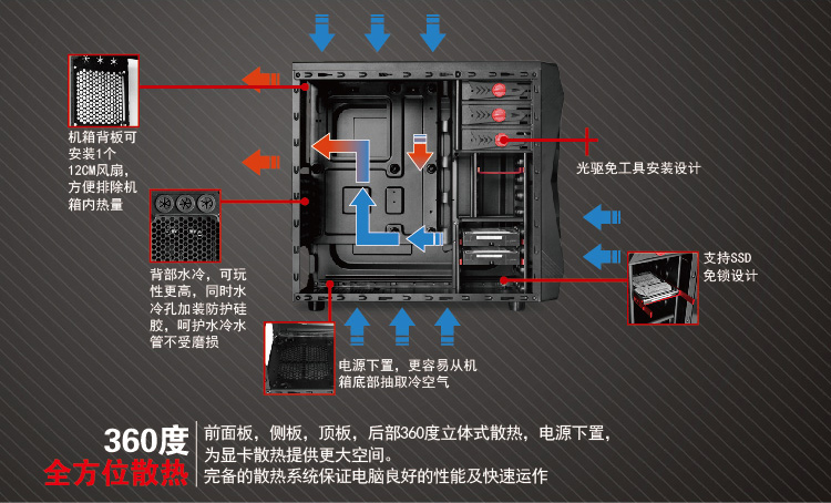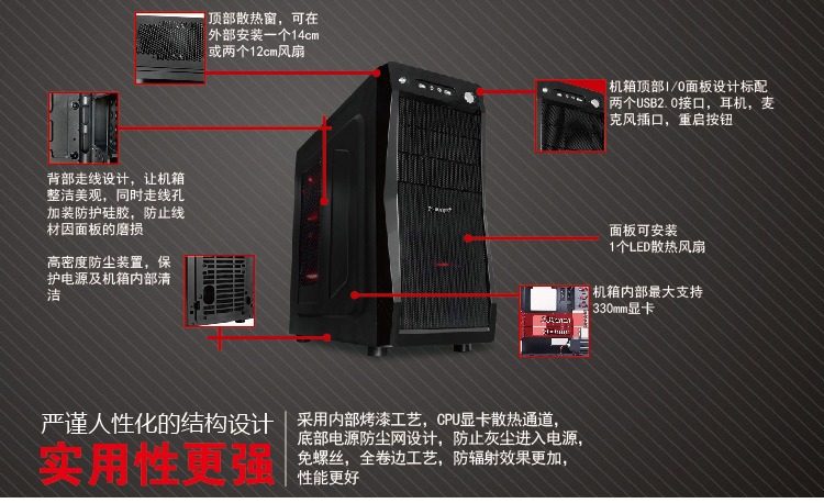 | 散热系统 | 面板:120mmLED风扇*2(选配) 侧板:120mmLED风扇*2(选配) 后置:80/90/120mm风扇*1(选配) |