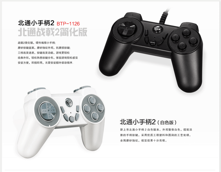 北通小手柄2是战戟2的简化版,同样采用了经典PS手柄外形设计,加上通体磨砂设计,人文的手柄设计理念让玩家更加舒心。 北通小手柄2的MACRO可以设为三档速度,分别为慢速,中速与快速,而且是三档连发速度,对于一定难度的动作可以轻松搞定。 安装方面,小手柄采用USB接口,无需复杂驱动,即插即用,随时享受游戏更加快捷。 |