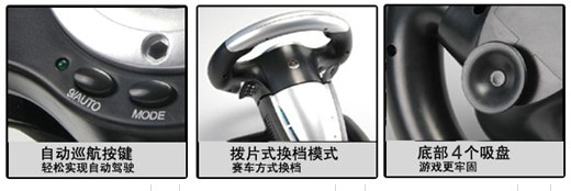 | 9. 方向盘底部设有4个强力吸盘,方便固定; 10.数字/模拟 两种操作方式,可随时切换,附带模式提示; 11.脚踏板水晶接头设计,牢固可靠; |