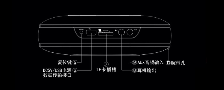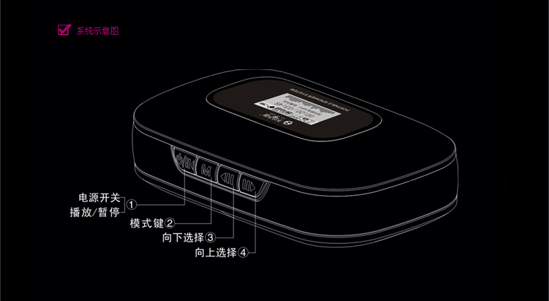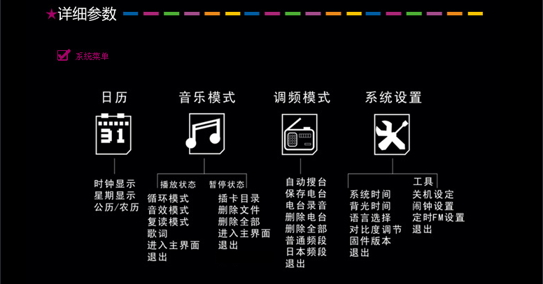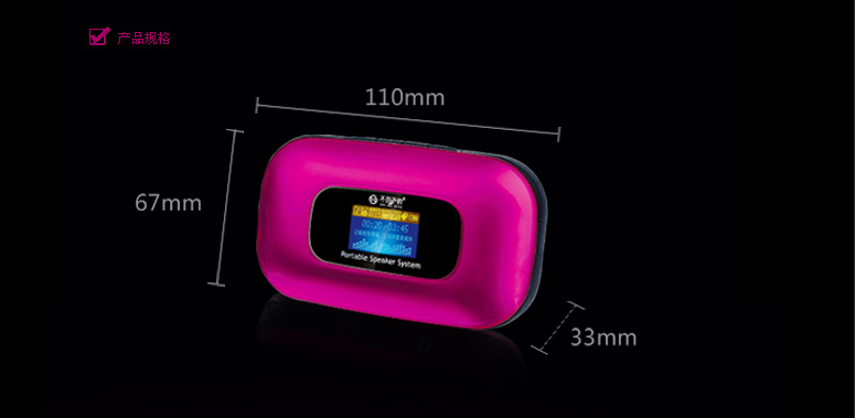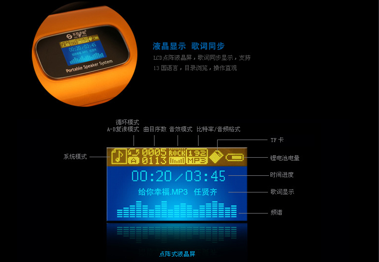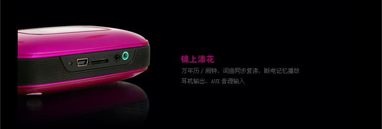 (2)FM调频收音 国内/日本双频段:内置FM调频收音模块、环绕天线,可进行FM定时设置、电台录音,自动电台搜索并存储电台,拥有国内/日本双频段,兼容校园广播。 (3)LCD液晶显示:歌词同步显示,词曲同步复读,支持13国语言。 (4)万年历/闹钟提醒:显示年月日及时钟,自动对应公历、农历、星期。可进行个性化音乐、闹钟周期及音量设定。 (5)定时关机具备定时关机功能,设定时间运行完后系统自动关机;待机状态约5分钟无操作或播放,系统将节能自动关机。 ((6)双模供电本系统内置锂电池,可通过USB接口充电使用;或使用DC5V的USB电源。 |
