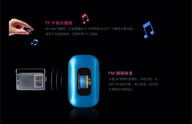 (1)TF卡音乐播放 MP3/WMA双解码:内置TF卡智能解码,可直接播放TF卡预存MP3/WMA格式音乐文件;内置读卡器功能,曲目文件直接拖放,完美支持TF卡直读。